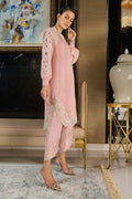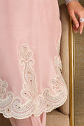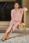 Primrose pink pure silk formal shirt with pure resham hand embroidery and heavy cut-work on front, back daman and sleeves. Paired with pure silk trousers with embroidery detail.