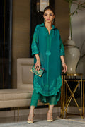 Emerald green long formal pure silk shirt in our signature box cut sillhouette. Intricaltely hand embroidered with pure resham thread work and beautiful cut work. Paired with pure silk matching pants with organza pleats detail.