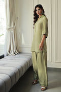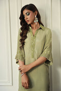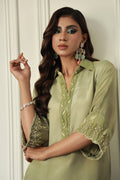 OurIara� olive green formal shalwar kameez features intricate floral hand embroidery of Resham, zardozi featuring Swarovski crystals, sequin & cut dana work. finished with a double scallop hemline.