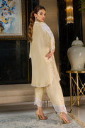 Ivory off-white pure silk formal shirt with pure resham hand embroidery and heavy cut-work on front, daman and sleeves. Paired with pure silk trousers with organza and embroidery / cutwork detail.