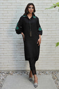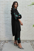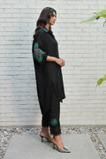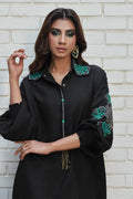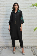 This beautiful black loose-fit shirt features formal hand embroidery of heavy resham cutwork, hand-made 3d flowers, and pearl embellishment with contrasting green, featuring a statement cutwork collar.