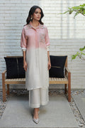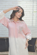 This pink and white ombre effect front open style formal shirt features contemporary formal hand embroidery of zardose, rhinestone, Swarovski crystals & chain work in the collar and pocket.
