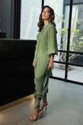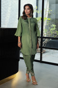 This seige green formal front open style shirt with 2 tone ombre effect features intricate floral hand embroidery of zardozi featuring rhinestone, pearl, sequin & bead work.