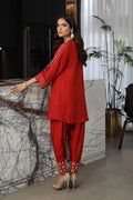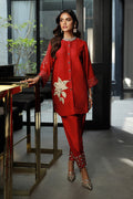 Make a statement in our scarlet signature front open-style shirt with formal hand embroidery of rhinestones, Swarovski crystals & chain work featuring embroidered floral applique lotus flowers and embellished button details. Paired with our signature tapered shalwar with embroidery detail to complete the look.