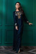 Deep Blue Formal Velvet Long Straigh Kaftan. Intricately Hand Embroidered with Zardose, Kora Dabka and Sequin Work Depicting Turkish Floral Motifs and Our Signature Mughal Deers.