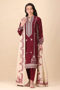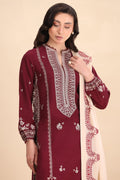 Scarlet - Immerse yourself in the epitome of winter luxury with Scarlet, a striking maroon ensemble that redefines elegance. The rich, deep hue is brought to life with delicate French beige taankas, meticulously embroidered to create a sophisticated yet contemporary tapestry. The lightweight, intricate threadwork adds an ethereal charm, while the cream shawl with embroidered borders exudes effortless refinement.