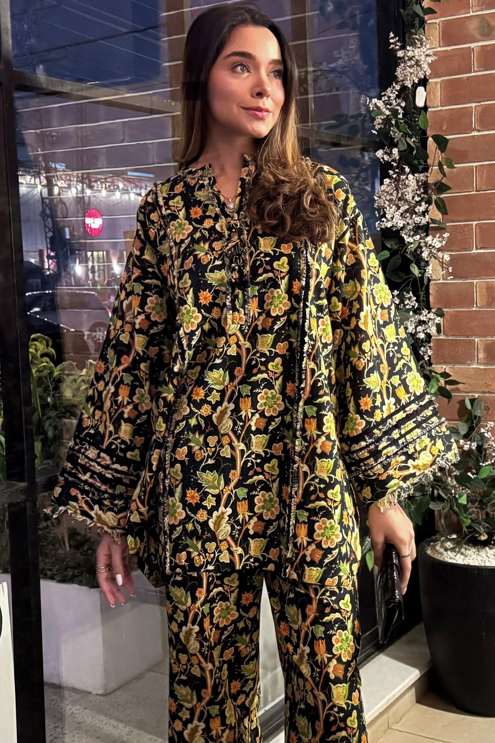 Introducing "Autumn Blaze", a two-piece khaddar set that mixes the cozy vibes of autumn with the cool edge of winter. The deep black base is the perfect canvas for the bold, vibrant autumn flowers, giving you all the warm, earthy feels while still keeping it fresh for the colder months.