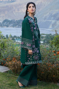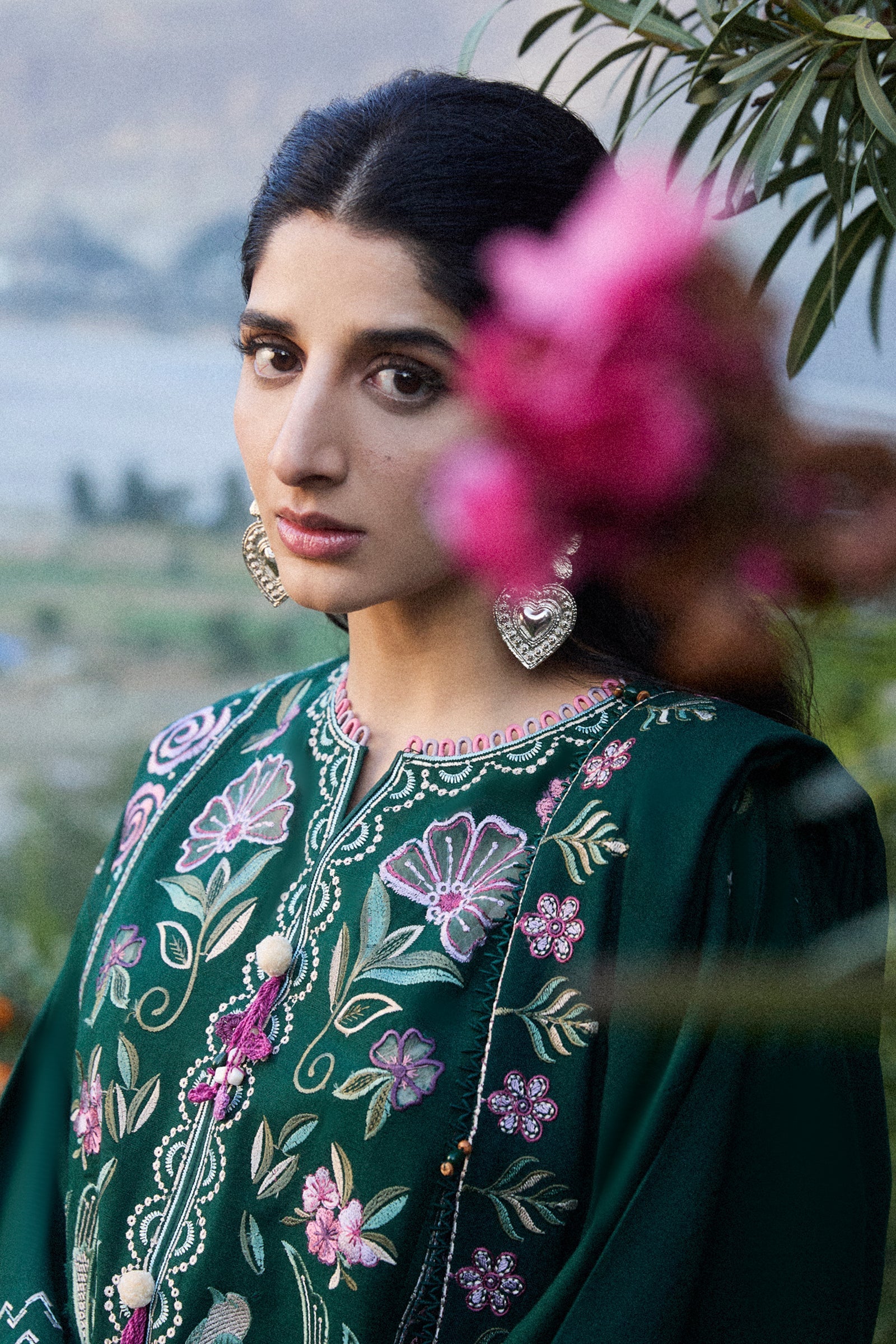 Arsin unfolds like a deep green jewel, its rich, luxurious hue serving as a canvas for artful elegance. Luminous ornamental and floral embroideries in delicate shades of lilac, berry, and sage bloom across the fabric, creating a tapestry of intricate beauty that enchants with every glance. This regal ensemble, crafted in warm, sumptuous khaddar, exudes an inviting depth, while the finely detailed laser-cut accents lend an artisanal flair. Accompanied by an exquisitely illustrated shawl and paired with tonal trousers, Arsin embodies the essence of the modern Zaha woman-confident, poised, and unafraid to stand out. Striking florals blend timeless ethnic charm with a contemporary edge, turning this ensemble into a wearable masterpiece that celebrates the elegance of a woman who commands attention with effortless grace.