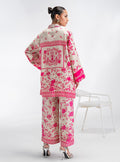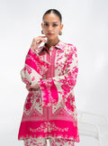 This absolutely stunning co-ord set, bursting with vibrant pink against a ivory backdrop. Crafted from a beautifully fluid fabric that feels luxurious and moves effortlessly with you, both the shirt and trousers are adorned with a bold, captivating floral print. The chic, relaxed silhouette of the shirt, featuring a stylish collar and sleeve details in striking solid pink, pairs perfectly with the matching printed trousers.
