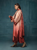 Saha is a captivating three-piece ensemble crafted from luxurious raw silk. This stunning outfit features a unique ombre transition from soft peach to vibrant coral, creating a breathtaking visual effect. The shirt is exquisitely adorned with intricate black embroidery, detailing the elegant V-neckline and extending in delicate patterns across the sleeves. A magnificent, large motif graces the back, adding an element of surprise and intricate artistry. The ensemble is completed with a flowing peach chiffon dupatta, subtly embellished with black floral embroidery.