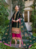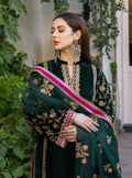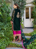 Sumptuous green velvet shirt is rendered with opulent embroidery in gold, decorating neckline, sleeves and daman. The ensemble makes a splendid look paired with contrasting embroidered pants and a rich organza dupatta.