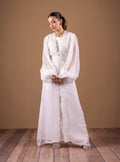 ntroducing all white jacket with a long inner. It gives a vision of ethereal elegance and timeless sophistication. Crafted with meticulous attention to detail, this exquisite ensemble combines the purity of white with the delicate transparency of organza, creating a breathtaking harmony of texture and grace. The upper gown features delicate detailing embroidery.