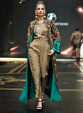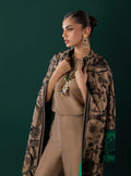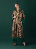 This elegant open kaftan features exquisite coffee-colored Kantha work, an intricate and traditional hand embroidery, adding a touch of artisanal charm. The deep green Kantha stitching on the sleeves and hem creates a beautiful contrast, Paired with matching pants and a coordinating inner, this outfit blends comfort with sophistication. The relaxed silhouette of the kaftan, combined with the vibrant yet earthy tones, makes it perfect for both casual and festive occasions, offering a modern twist on a timeless style.