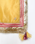 Sherbati - A Classic tissue Gharara set includes flared classic gharara with knee length shirt styled with contrasting dupatta embellished with Gota laces and handmade latkans. Includes: Shirt, Pants, Dupatta Color: Pink/Yellow..