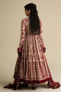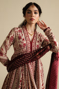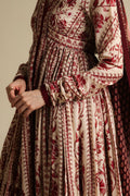 Inspired by age-old Kashmiri shawls, Kashmiri is a classic ivory Anarkali enriched with deep pink print. This delicate Pima-Lawn ensemble features floral vines and linear patterns running vertically across the panels, paired with a silk maroon dupatta.