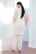The white kurta showcases intricate self-on-self embroidery in panels, paired with matching trousers. The outfit feels soft and airy, embodying a serene, ethereal elegance.