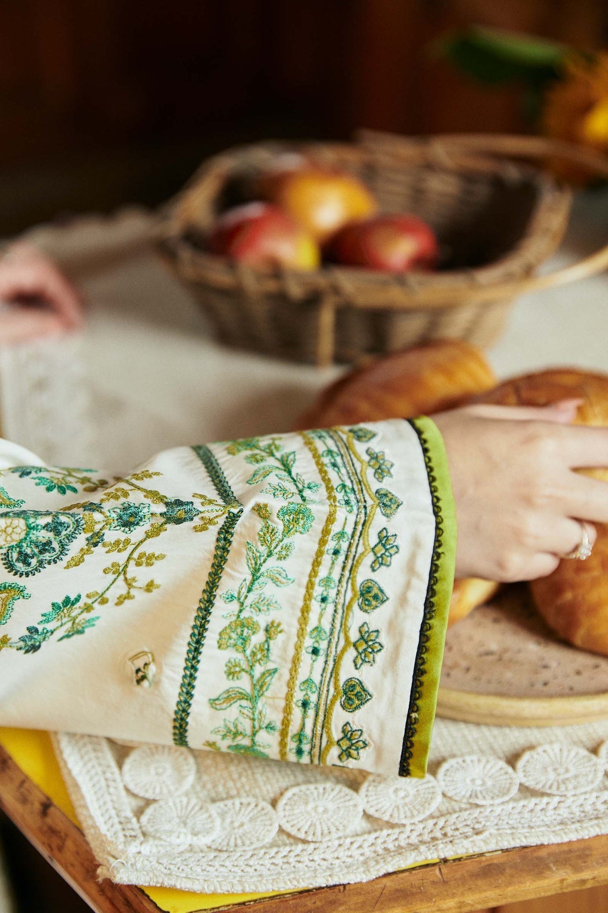 Arela- Inspired elegance graces this chic ensemble in a captivating stone shade. A contemporary shirt, enriched with mesmerizing delicate embroidery cascading over the complete attire, harmonizes exquisitely with a chiffon dupatta.