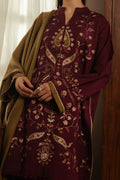 A short maroon shirt with embroidery and applique details paired with a farshi shalwar and a contrasting embroidered shawl.
