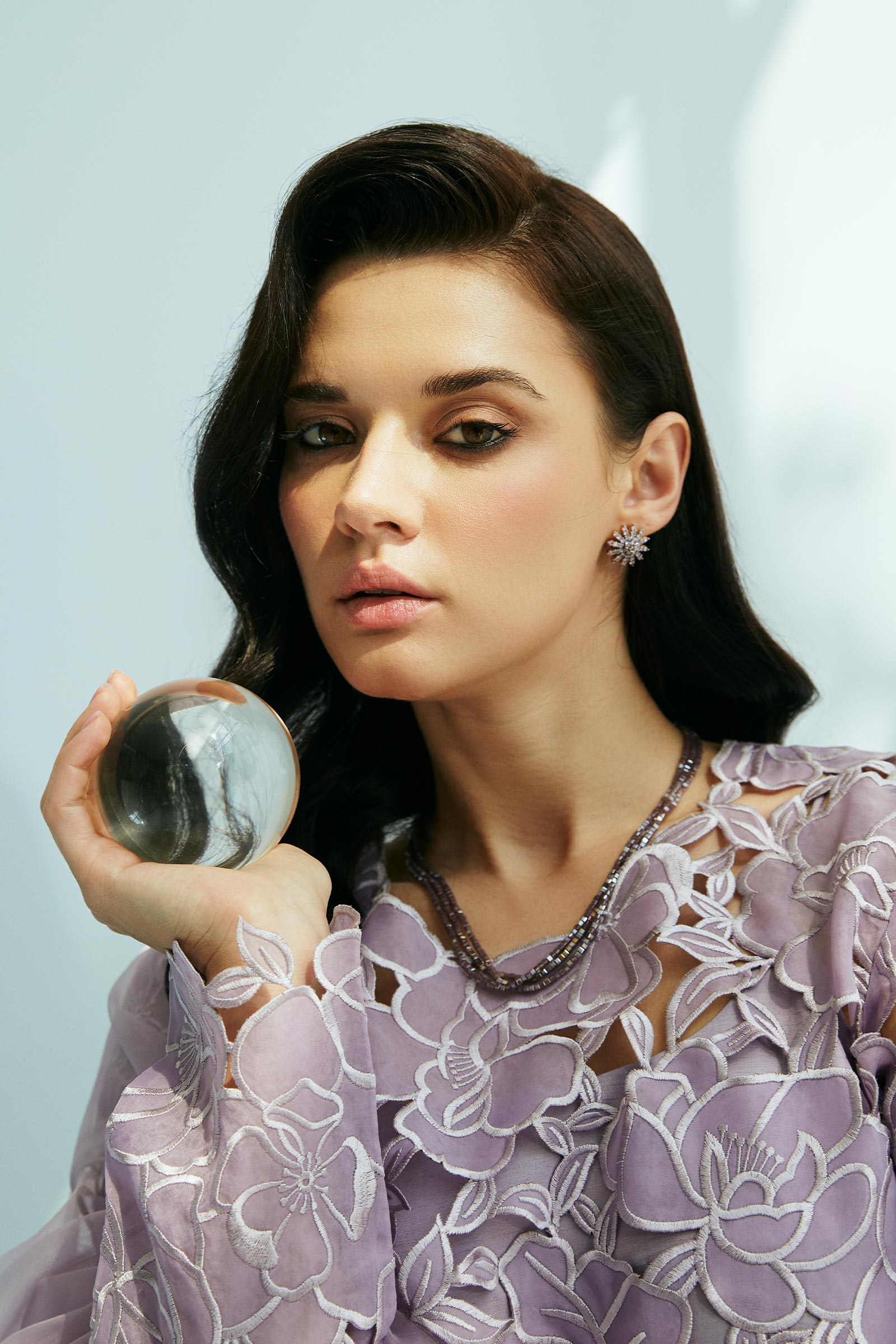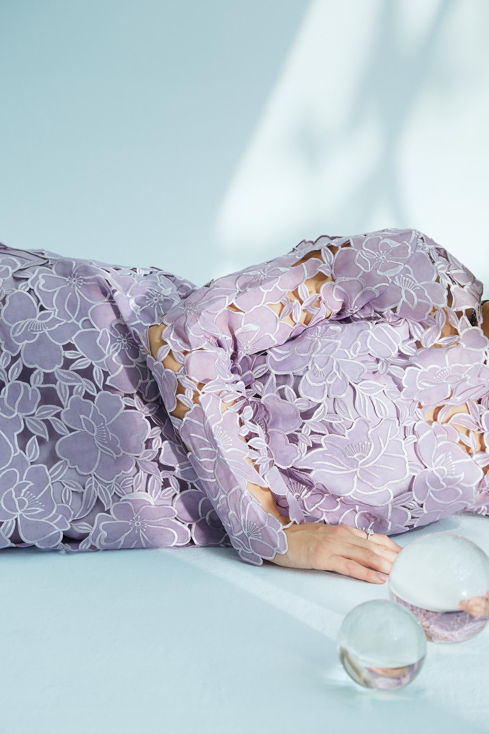 A stunning lilac ensemble features exquisite cutwork on the front, back, and sleeves and is styled with a thin strap slip, straight trousers, and a silk-finished dupatta.