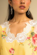 Our vibrant yellow matching set has a floral-panelled short kurta, featuring an intricately embroidered neckline. It is paired beautifully with a matching farshi shalwar.