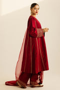 A vibrant red panelled kurta featuring a neckline adorned in zardozi and resham. The detailed embroidery on the sleeves is harmoniously paired with a shalwar and an organza dupatta with corner motifs. This look effortlessly combines traditional and modern aesthetics for your special occasions.