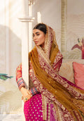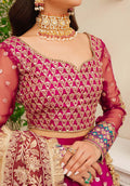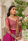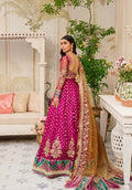 Turn heads at any musical event for the season with this vibrant ensemble. Introducing €˜Airas an enchanting couture ensemble that is set to steal the spotlight. A vibrant magenta lehnga and Choli ensemble, itss radiates an irresistible luminosity. The magenta fabric is adorned with gold embroidered sequins and the floral motifs are decorated with dabka, beads and sequins. The Choli gleams with the same magenta hue, embellished with tilla and sparkling tinsel sequins accents that casts an enchanting glow. This dress is paired with a diaphanous dupatta framed with magenta embroidered borders, it is a piece of art in itself.
