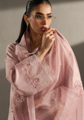 Introducing our latest collection, featuring a stunning ensemble that includes a powder pink silk kurta-style shirt adorned with a hand embellished neckline, laces and pleats, embellished with applique organza, sleeves accented with intricate sequins work. The shirt showcases exquisite stitching details, loops, and pleating details, the hem is beautifully finished with sequins work and laces. Paired with silk culottes featuring delicate embroidered applique work, this outfit is complemented by an organza dupatta with hand embellished sequins motifs, seamlessly transitioning into lace details.