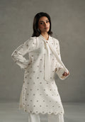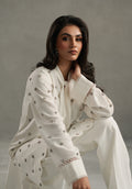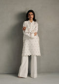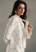 Delicate floral unfurl like moonlit tendrils across the lustrous pearl white canvas of "OPAL"- The design boasts a scintillating whorl of intricate flowers, exquisitely rendered in silvery stones and crystals, creating a mesmerizing composition. Encased by a finely detailed scalloped border paired with tailored boot cut trousers, this timeless masterpiece epitomizes refined elegance.