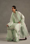 A resplendent creation in mint blue that epitomizes contemporary luxury and effortless glamour. This stunning ensemble commands attention with a statement pearl encrusted neckline-a flawless stroke of brilliance exuding an aura of opulence. Every detail is a work of art, from the hand-crafted embellishments that shimmer exquisitely with each movement to the tonal raw silk trousers adorned with delicate embroidered borders, evoking the allure of stardust woven seamlessly into fabric. Completing this masterpiece is an organza dupatta encrusted with glittering sequins, radiating an ethereal elegance that leaves a lasting impression. Designed for the sophisticated woman who embodies grace with every step.