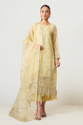 Immerse yourself in understated elegance with the Soft Sands Oat color 3-piece embroidered suit. The sophisticated organza fabric features fine embroidery on panels, sleeves, and dupatta with ornate borders. Hand embellishments elevate the design for special occasions. Complete with a comfortable dyed slip and raw silk trouser, this formal wear ensemble offers timeless sophistication.