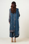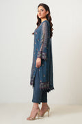 Turn heads in Midnight Sapphire in blue ashes hues, an opulent 3-piece embroidered suit. Chiffon fabric adorned with intricate embroidery on the dupatta, panels, and sleeves creates a striking look. Borders add a refined touch, while hand embellishments elevate the ensemble. Paired with raw silk trouser, this elegant suit is perfect for evening festivities.